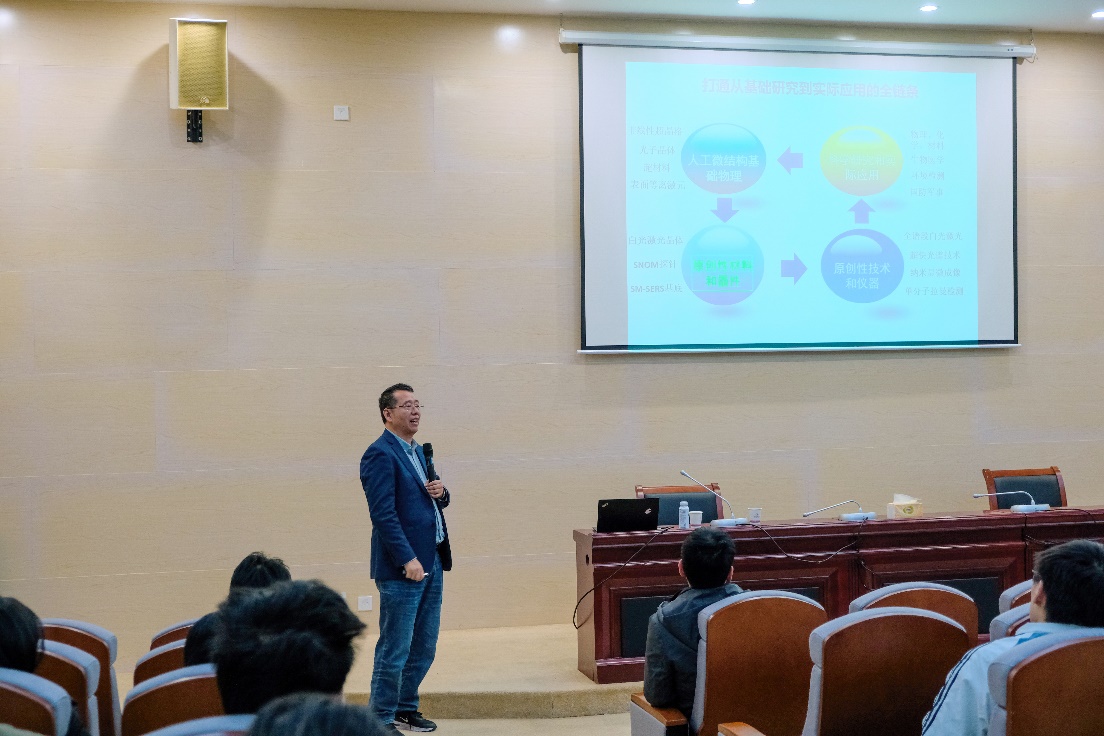 报告中,李志远教授介绍了团队近年来两大前沿研究进展全谱段白光激光的创制和单分子拉曼检测的实现。经过11年努力,团队提出以中红外飞秒强激光为泵源,二阶三阶非线性协同的高次谐波上转换+脉冲内自差频下转换的原创性策略,成功实现了单脉冲能量mJ量级、带宽涵盖 200-25000nm、光谱平坦度优于20aB的深紫外-可见-中远红外全谱段白光激光,综合技术指标远超过同类型超连续激光装置水平,并开辟了高速摄谱技术和泵浦-探测超快光谱技术的新天地。团队深耕基础物理20年,发明了等离激元纳腔-二维材料SERS基底,发现了原创性的库仑力驱动的分子-热点自发配对机制,实现了对RhB/R6G/CV等标准拉曼分子15个数量级的拉曼信号增强、低至10-18 mo1/L的检测灵敏度以及快至50ms 的拉曼成谱时间,突破了制约高质量SM-SERS的一个关键性技术瓶颈,大大降低了单分子拉曼检测的门槛。在提问互动环节中,李志远教授耐心细致地师生答疑解惑,深入浅出地将专业知识和日常生活结合起来进行讲解,同学们纷纷表示收获颇佳。
