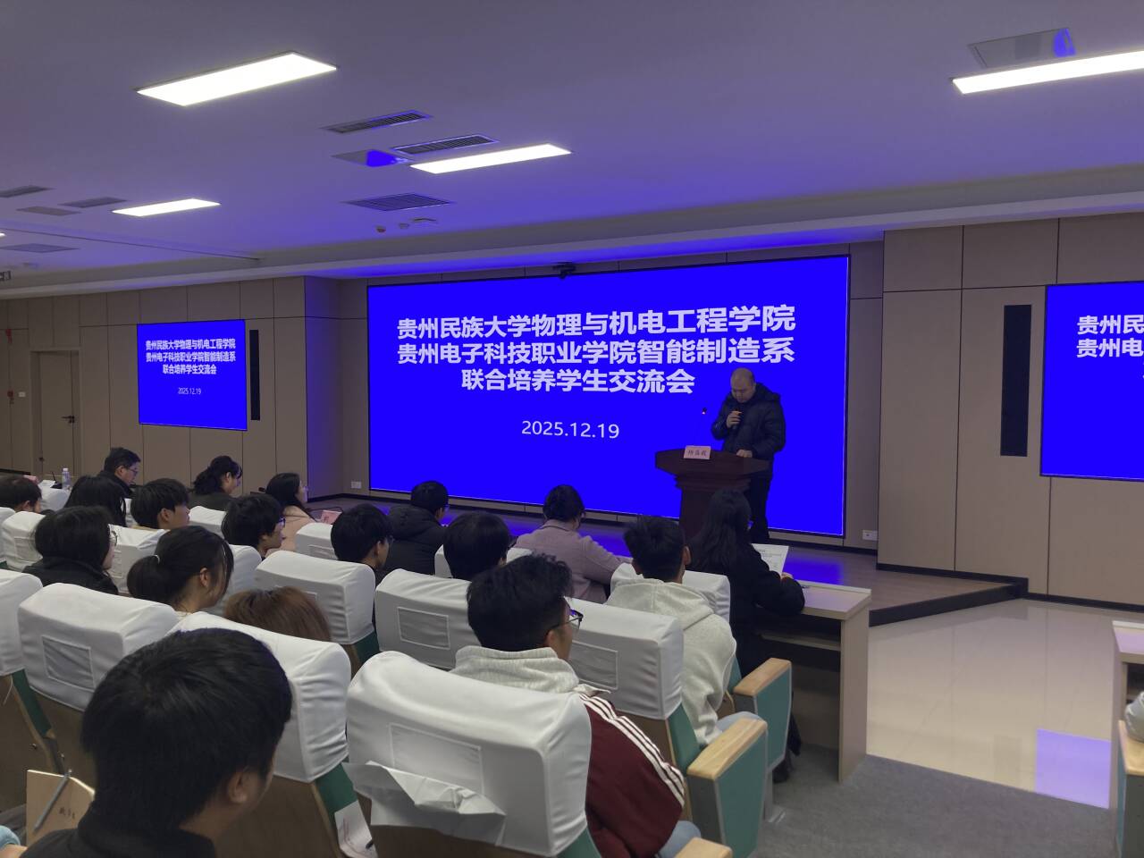 2025年12月19日10:30,为进一步深化校际联合培养工作,明确自动化(专升本)学生培养目标、毕业要求及发展路径,切实解决学生学业与发展中的困惑,贵州民族大学物理与机电工程学院与贵州电子科技职业学院智能制造系在贵州电子科技职业学院凌飞坊四楼报告厅,联合举办自动化(专升本)联合培养学生座谈交流会。会议由贵州电子科技职业学院智能制造系党总支副书记、教工党支部书记何金焕主持,贵州民族大学物理与机电工程学院党委副书记管延庆、副院长杨盛毅一行7人及辅导员、班主任与2024级、2025级150余名学生共同参会。